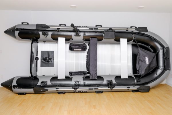 Introducing the Stryker PRO 500 inflatable boat (the largest roll up in our line to date! This inflatable boat comes with the added protection of 1.8mm wrapped with our Stryker Shield® under the entire bottom of the boat. Since it’s launch in 2018, it has quickly become one of the most popular boats we have sold. We add a 20” transom for the ability to add a JET outboard for extreme shallow water use. Please note: this model requires a 20” prop motor. This is the perfect inflatable boat for a large group of adventure seekers paired with a 30-50HP long shaft(prop) outboard or a 35-40HP JET. This inflatable boat is commonly paired with a Stryker Boat Trailer and various console options.